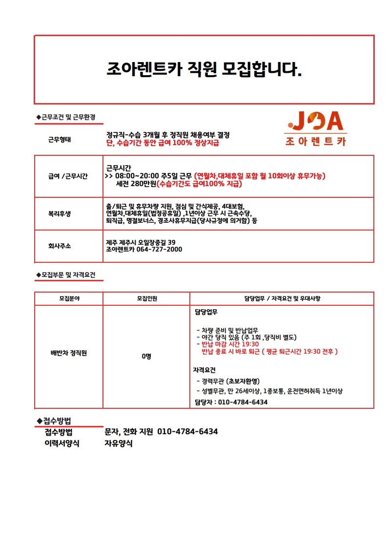 ☆★ 조아렌트카 배차 정직원 / 출퇴근 휴무 차량 지원 페이지 정보 작성자 쎄OO어 작성일25-10-07 17:27 조회341회 연락처 010-4784-6434 급여 월급 : 280만원 관련링크 본문 주소 : 제주특별자치도 제주시 오일장중길 39 조아렌트카 이전글 다음글 목록