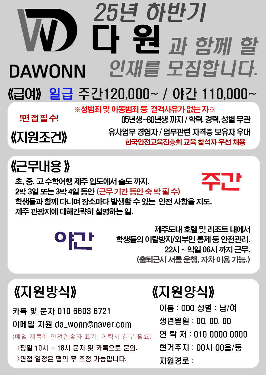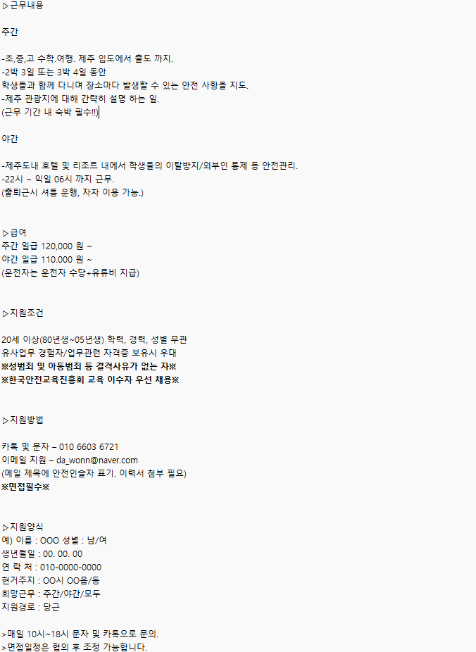 10월 단기 수학여행 주간 안전인솔자 모집 페이지 정보 작성자 dOOOOn 작성일25-09-22 09:56 조회194회 연락처 010-6603-6721 급여 일당 : 120000 관련링크 본문 . 주소 : 제주특별자치도 제주시 삼무로 15 연동태홍누리안3차아파트 204호 이전글 다음글 목록