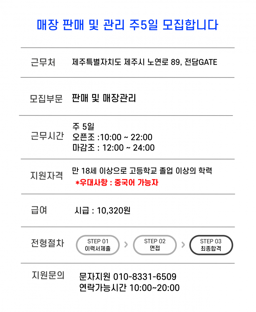 ★★★세상에서 제일 쉬운 판매직 직원을 구합니다★★★ 페이지 정보 작성자 곽O식 작성일25-10-29 17:54 조회83회 연락처 010-8331-6509 급여 시급 : 10,320 관련링크 본문 ■ 주업무 : 고객이 물건 선택하면 결제 후 봉투에 담아드리기. 외워야 할 내용 거의 없음. ■ 근무지 : 연동 주소 : 제주특별자치도 제주시 노연로 89 1층 전담GATE 이전글 다음글 목록