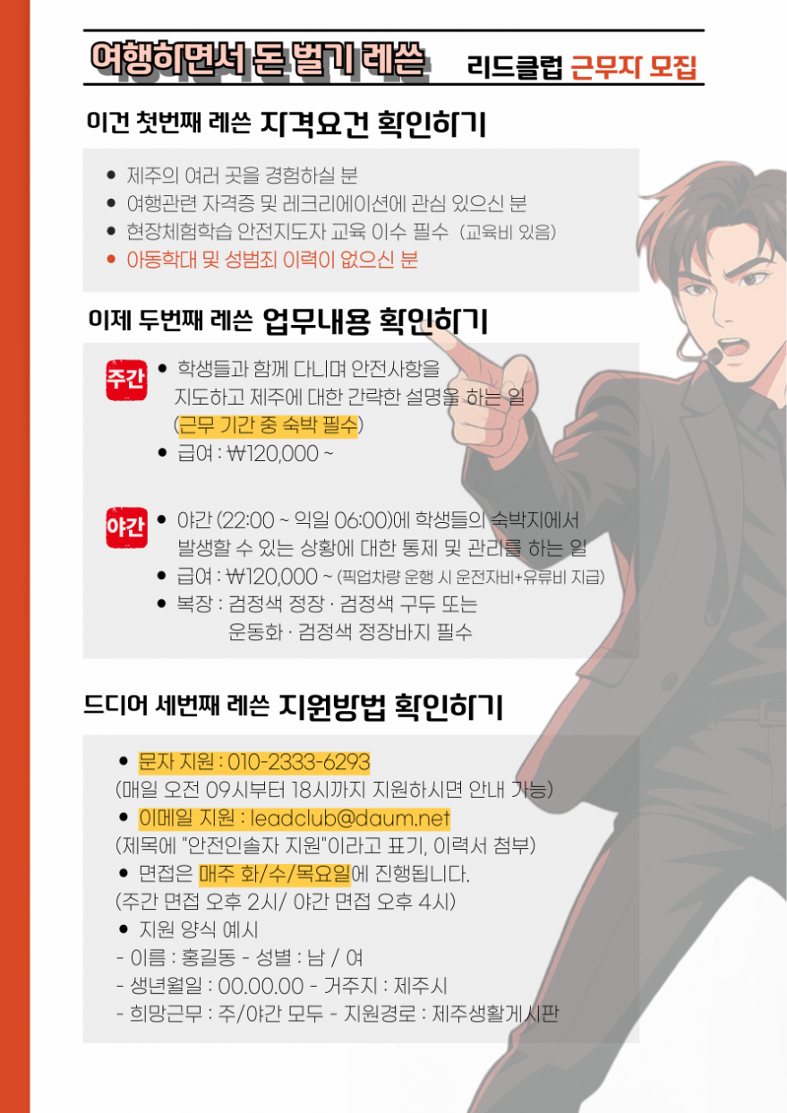 ☆제주_수학_여행_인솔자_근무자구인☆!!!& 페이지 정보 작성자 차OO만 작성일25-09-28 18:00 조회515회 연락처 010-5227-3021 급여 일당 : 130,000 관련링크 본문 주소 : 노연로 55 4층 이전글 다음글 목록