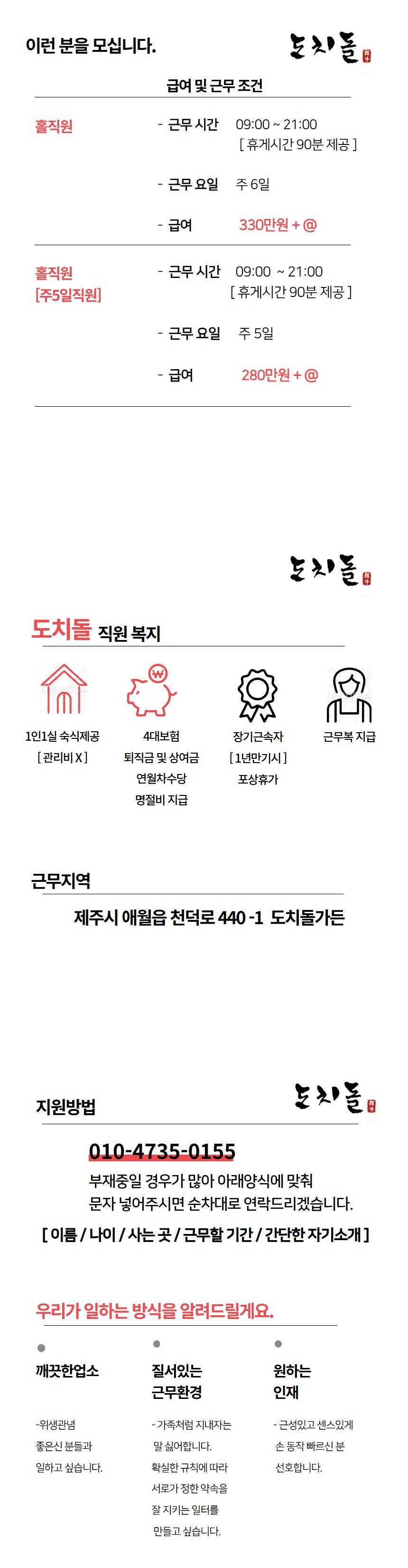 [숙식제공/1인1실]_280,330만원_홀직원_모집 페이지 정보 작성자 gOOOOOOOOO8 작성일25-09-25 07:52 조회466회 연락처 010-4735-0155 급여 월급 : 330만원 관련링크 본문 . 주소 : 천덕로440-1 이전글 다음글 목록