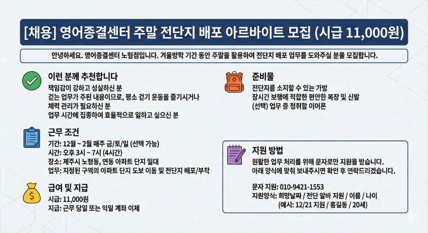 [주말 꿀알바] 영어학원 전단지 배포 알바 모집(친구랑 같이 지원!) 페이지 정보 작성자 lOOOOOe 작성일25-12-10 20:04 조회422회 연락처 010-9421-1553 급여 시급 : 11,000 관련링크 본문 주소 : 제주특별자치도 제주시 월랑로 59 세흔빌딩 6층 영어종결센터 노형학원 이전글 다음글 목록