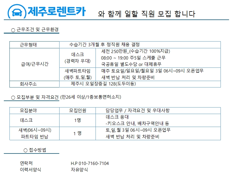 제주로렌트카 데스크 직원/새벽파트타임 구합니다. 페이지 정보 작성자 jOOOOOOOOt 작성일26-01-23 12:02 조회87회 연락처 010-7160-7104 급여 월급 : 2500000 관련링크 본문 문의사항은 문자주세요~ 주소 : 제주특별자치도 제주시 오일장중길 128 제주로렌트카 이전글 다음글 목록
