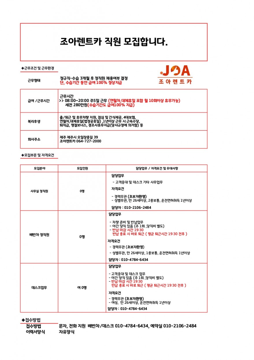 ⭐໒(◉ᴥ◉)७조아렌트카 / 예약실데스크배차 / 출퇴근휴무차량지원 페이지 정보 작성자 jOOOOa 작성일25-12-17 08:54 조회35회 연락처 010-4784-6434 급여 월급 : 280만원 관련링크 본문 주소 : 제주특별자치도 제주시 오일장중길 39 조아렌트카 이전글 다음글 목록