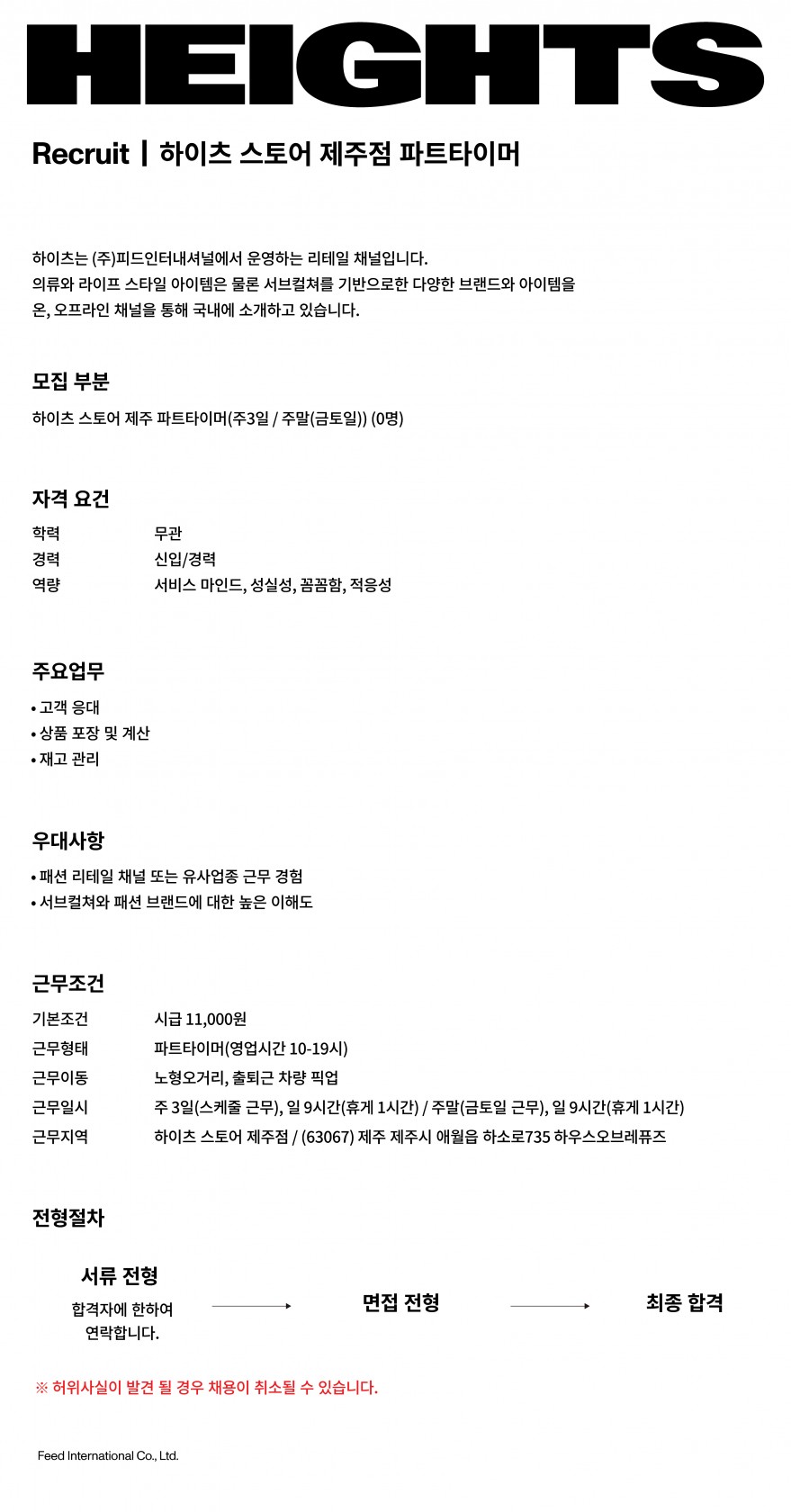 HEIGHTS 하이츠 제주 파트타이머 페이지 정보 작성자 jOOOOOu 작성일25-11-25 18:21 조회617회 연락처 010-9032-9337 급여 시급 : 11000 관련링크 본문 접수 기간 및 방법• 접수 기간: 채용 시 마감• 제출 서류: 이력서 및 경력 기술서 첨부 필수• 접수 방법: recruit@feedintl.com 주소 : 제주특별자치도 제주시 애월읍 하소로 735 이전글 다음글 목록