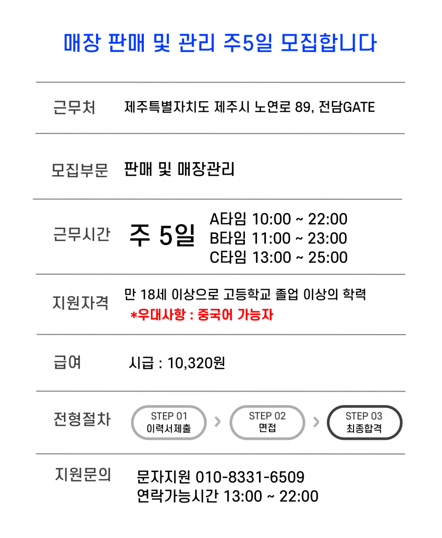 ★★★세상에서 제일 쉬운 판매직 직원을 모집합니다★★★ 페이지 정보 작성자 곽O식 작성일25-12-08 18:02 조회107회 연락처 010-8331-6509 급여 시급 : 10,320 관련링크 본문 ■ 주업무 : 고객이 물건 선택하면 결제 후 봉투에 담아드리기.외워야 할 내용 거의 없음.■ 근무지 : 연동 주소 : 제주특별자치도 제주시 노연로 89 1층 전담GATE 이전글 다음글 목록