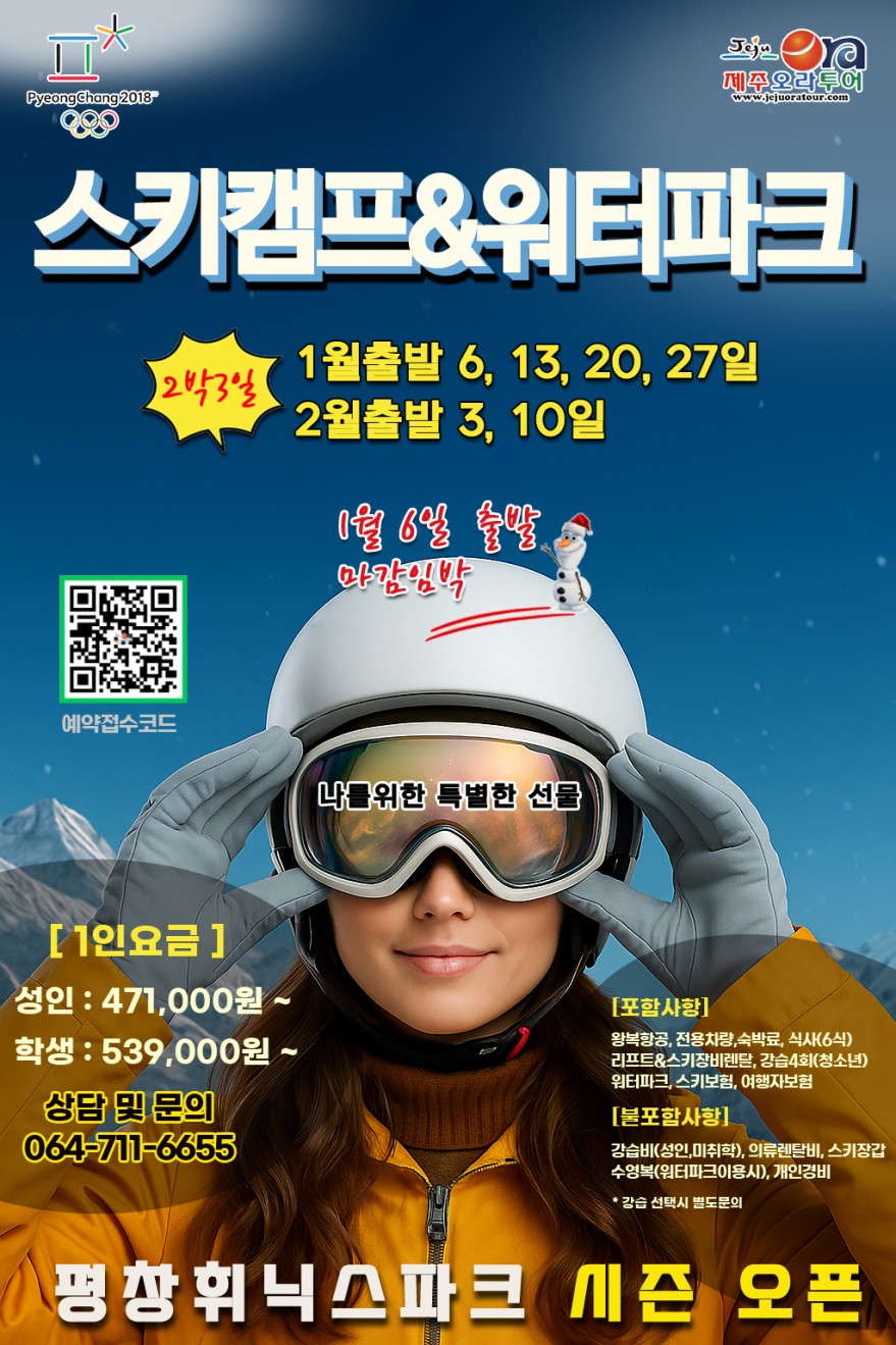 제주오라투어진행2026년1월~2월매주화요일출발/스키기초강습/워터파크이용