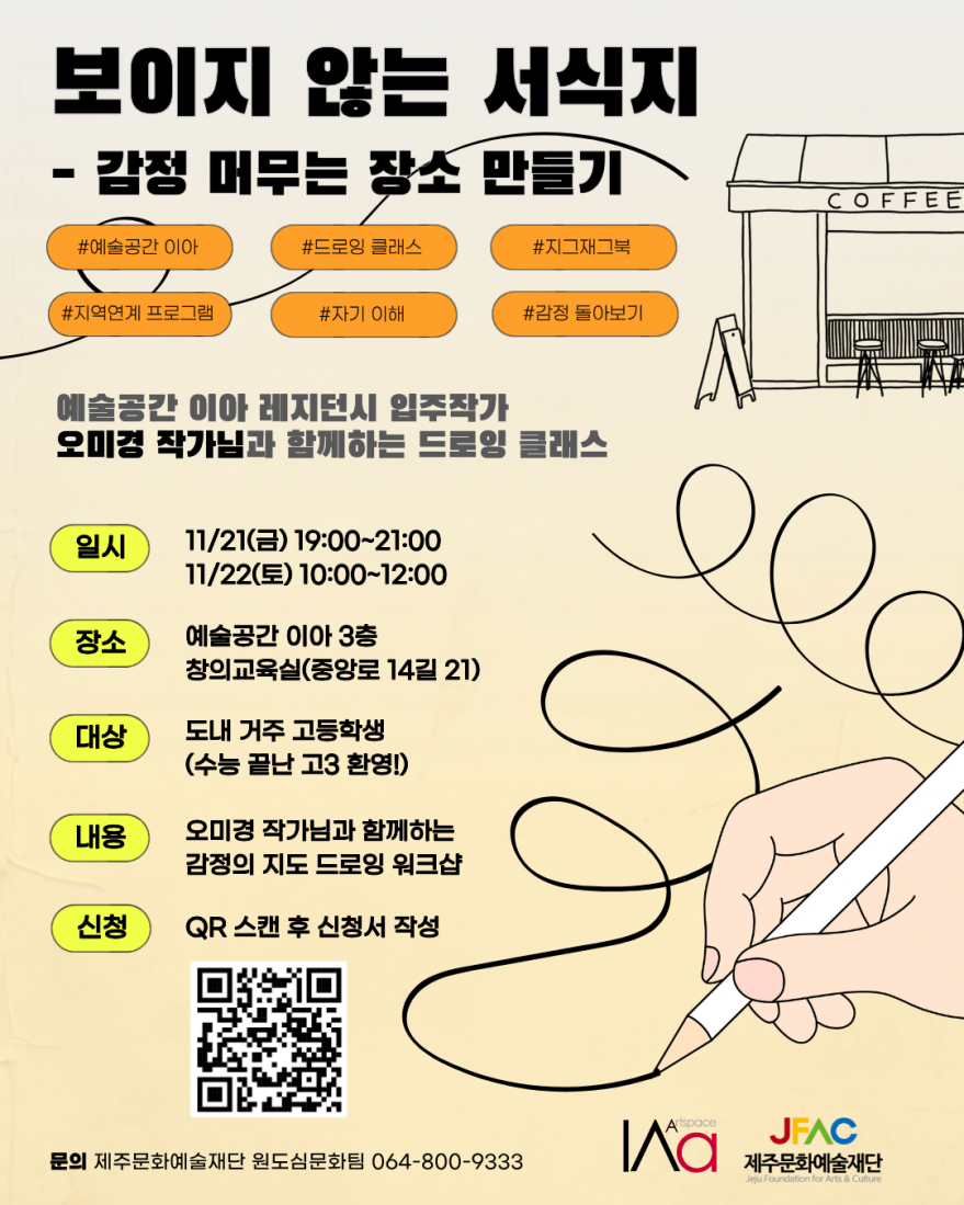 예술공간_이아_지역연계_프로그램<보이지_않는_서식지-감정_머무는_장소_만들기>드로잉_클래스_참여자_모집 페이지 정보 작성자 이바 작성일25-11-15 11:21 조회6회 연락처 010-000-0000 관련링크 본문 세부사항홈페이지참고https://www.jfac.kr/notification/notice/19589?page=1 다음글 목록